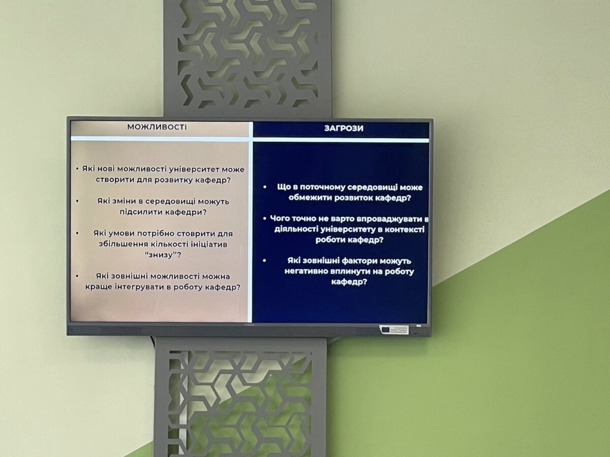 — SWOT-аналіз, у межах якого завідувачі кафедр спільно проаналізували сильні та слабкі сторони університету, а також ризики, загрози й можливості в умовах сучасних трансформацій системи вищої освіти;